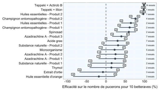 Lorsque la barre horizontale de chaque produit croise la barre verticale pointillée alors l’efficacité du produit n’est pas significative. Ce graphique ne permet pas de comparer les solutions testées entre elles.