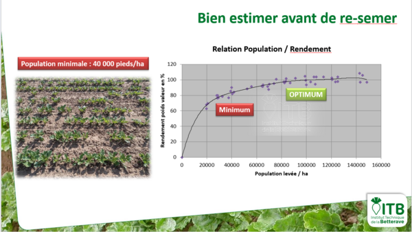 Une décision de ressemis se prendra à l'issue de cette évaluation, si la population est inférieure à 40 000 plantes/ha, soit 20 betteraves/dam à 50 ou 18 betteraves/dam à 45.
