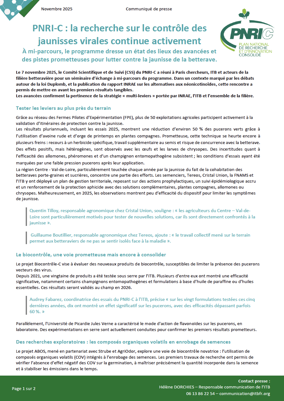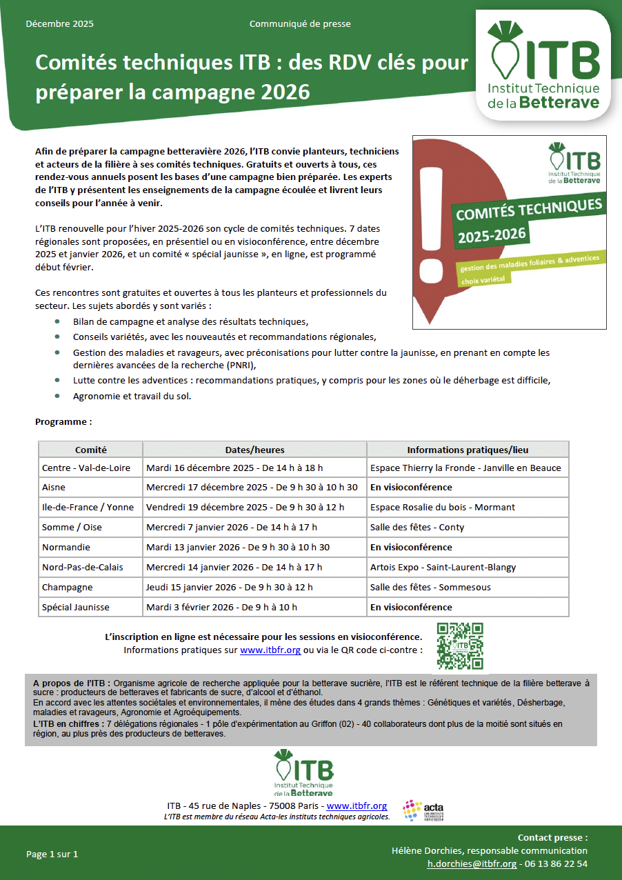 Bienvenue dans l'espace destiné aux journalistes de l’Institut Technique de la Betterave, le référent de la recherche appliquée pour la betterave sucrière.