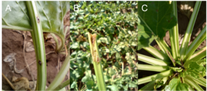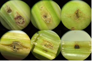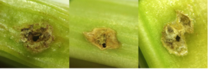 Trous d’émergence de L. juncii dans le pétiole (à gauche) et dans la racine (à droite)