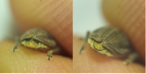 Jeunes adultes de L. juncii. Individus recouverts d’une couche orangée (A et B) et individu bicolore suite à un contact dans les doigts (C)