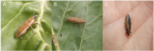 L’observation des adultes peut être difficile lorsque la pression est faible car ils se laissent aisément tomber au sol dès qu’ils perçoivent un danger. Ils se trouvent le plus souvent sur le haut des feuilles ou au niveau du collet. Des pièges à phéromones sont en cours de test par la filière porte-graine ainsi que par l’ITB afin d’améliorer la détection des adultes dans les parcelles.