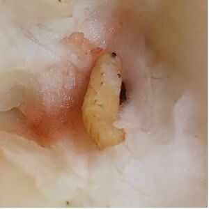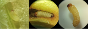 La larve est de type vermiforme apode (absence de pattes), de couleur blanche avec une tête foncée bien définie.