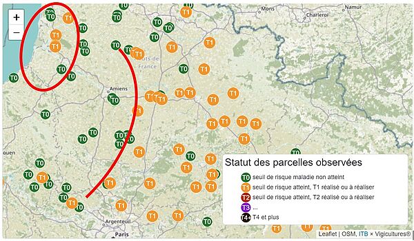 Nous constatons une évolution de la présence de celle-ci sur la délégation. En effet, 12 parcelles ont atteint le seuil T1 sur la cercosporiose, dont 8 ce lundi. Les secteurs les plus à risques sont l'Est et le Sud de l'Oise, et pour la Somme l'Est et la bordure côtière (voir carte ci-dessous).