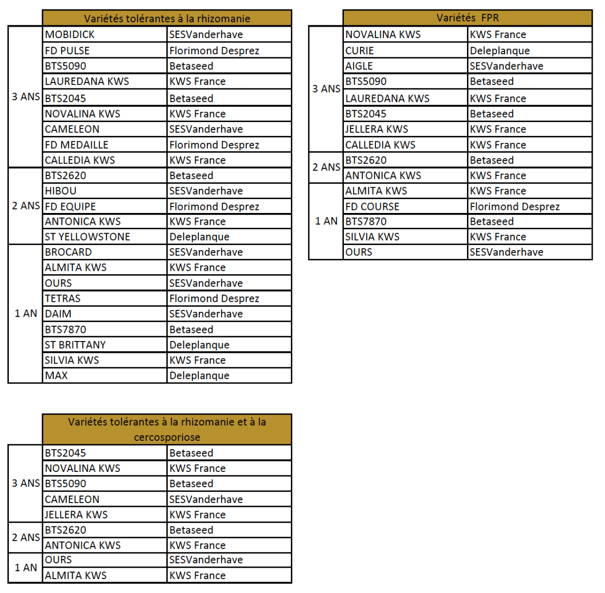 Variétés tolérantes à la rhizomanie et au rhizoctone brun :