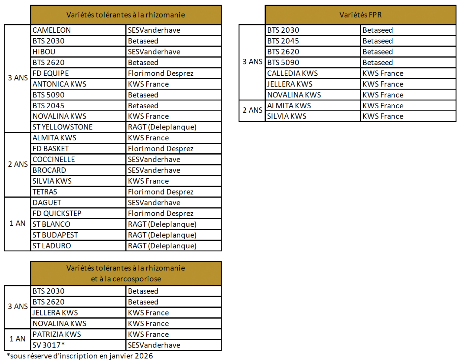 Variétés tolérantes à la rhizomanie et au rhizoctone brun :