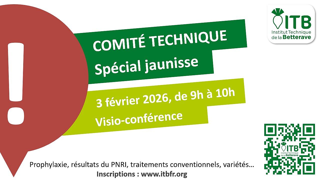 Un comité technique spécial consacré à la gestion de la jaunisse vous attend début février pour vous accompagner dans votre lutte contre cette maladie en 2026. Les ingénieurs de l'ITB et des Services Agronomiques des Sucreries animeront cette visioconférence, qui se clôturera par un temps d'échange durant lequel vous pourrez poser toutes vos questions.
