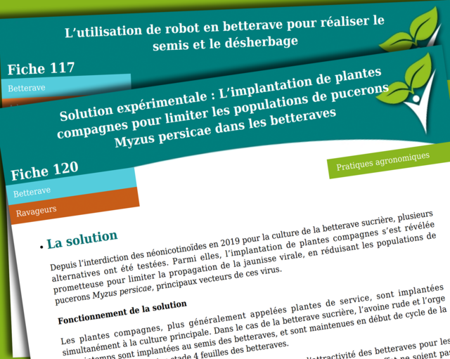 - La fiche n°120 traite de l’implantation de plantes compagnes pour limiter les populations de pucerons (Myzus persicae) en betterave. Cette approche agroécologique repose sur l'implantation de plantes de service (avoine rude et orge de printemps) simultanément au semis des betteraves pour perturber les ravageurs. Cette technique demande une grande technicité : destruction des plantes compagnes au bon moment pour maximiser leur effet répulsif des betteraves pour les pucerons, tout en évitant la concurrence avec les betteraves.