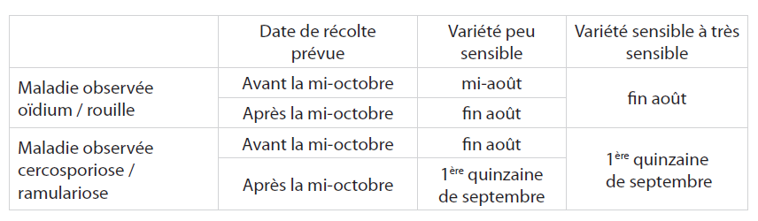 Les traitements tardifs (après la 1ère quinzaine de septembre) sont rarement valorisés, surtout à moins de 45 jours de l'arrachage.