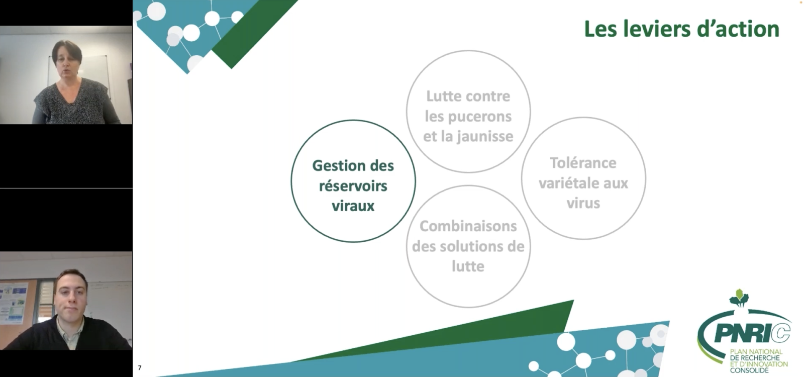 Après un rappel de la situation sanitaire observée lors de la campagne précédente et une présentation de la poursuite des travaux de recherche menés dans le cadre du PNRI-C, les différents leviers mobilisables pour la gestion de la jaunisse ont été détaillés. L'accent a été mis en priorité sur la gestion des réservoirs viraux, considérée comme un levier indispensable pour inscrire la lutte contre la jaunisse dans la durée et nécessitant une mise en œuvre collective pour être pleinement efficace. Ensuite, d'autres moyens de lutte ont été abordés, tels que les produits aphicides, les produits de biocontrôle, les plantes compagnes et les lâchers d'auxiliaires. La réunion s'est conclue par un point sur les recherches en cours concernant la tolérance variétale aux virus et sur l’importance d’une approche combinant l’ensemble des leviers.