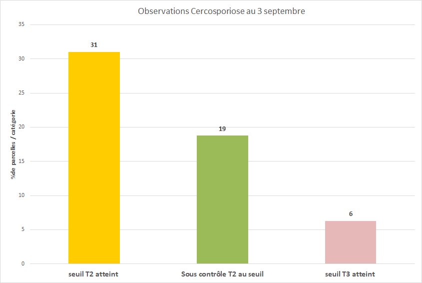 Les observations du réseau BSV pour cette semaine montrent que la pression cercosporiose remonte actuellement en région Centre - Val-de-Loire. Les symptômes sont présents dans la quasi totalité des parcelles du réseau.