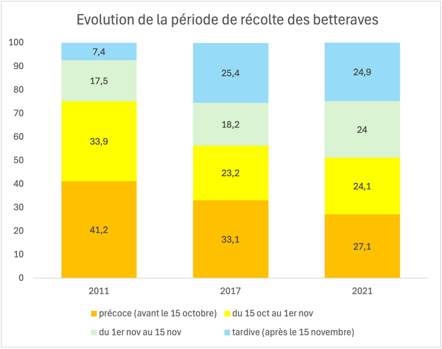 L’allongement des durées de campagne impacte les arrachages : sur ces dix dernières années (2011-2021), ce sont 50 % des surfaces qui sont désormais récoltées après le 1er novembre.