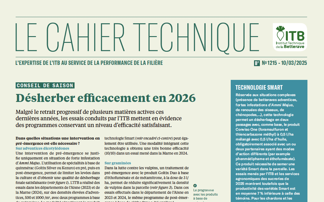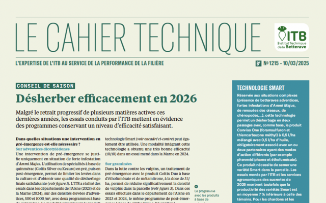Les 2 premières pages du cahier central du Betteravier Français 1215 présentent les conseils de l'ITB en matière de désherbage pour 2026 :