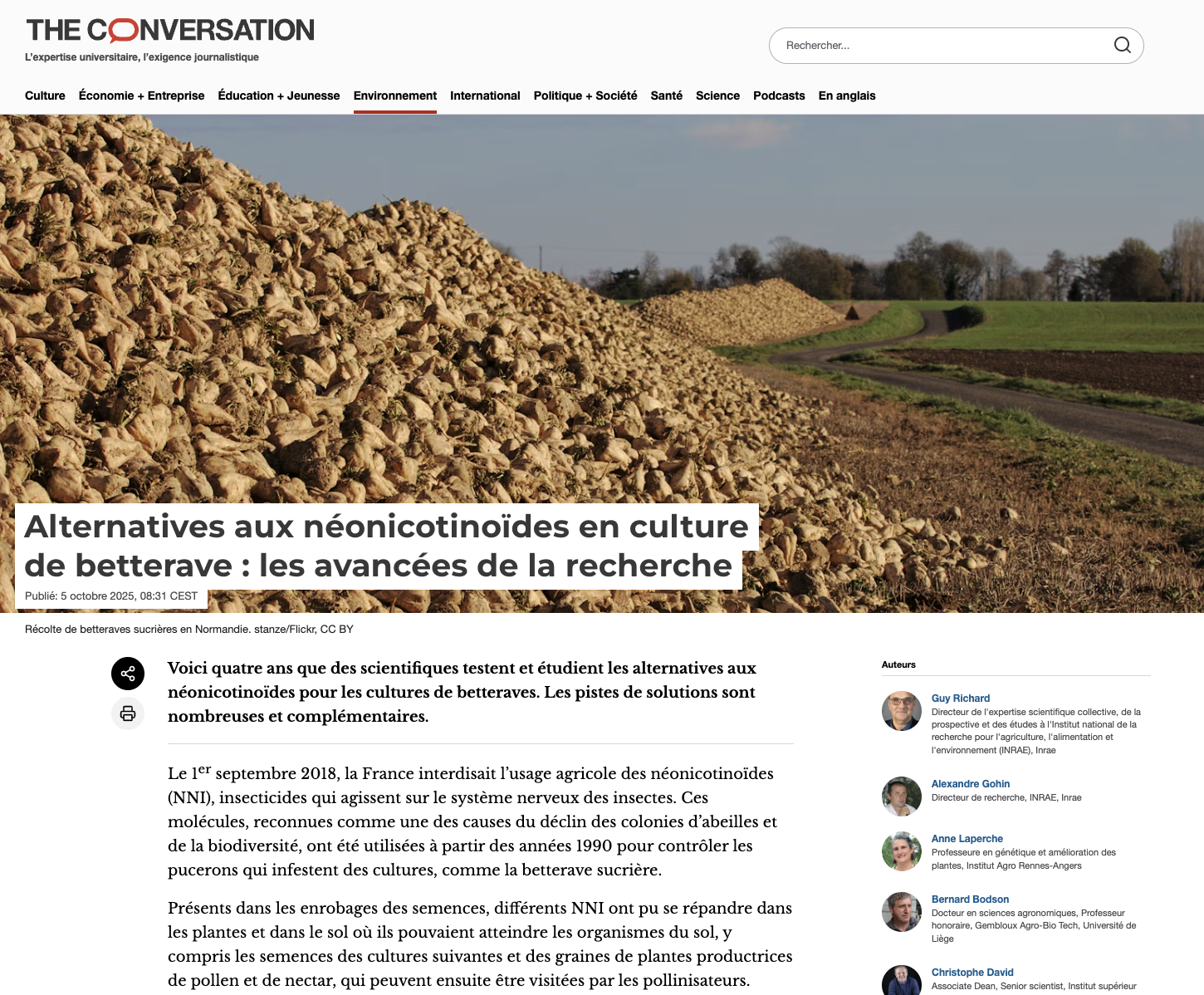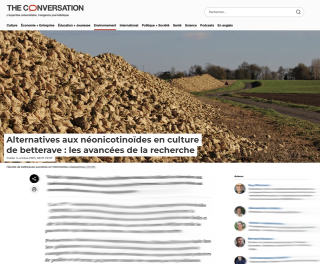 Le conseil scientifique du Programme national de recherche et d’innovation (PNRI) a publié, le 5 octobre, une tribune dans le média scientifique The Conversation, intitulée « Alternatives aux néonicotinoïdes en culture de betterave : les avancées de la recherche ».