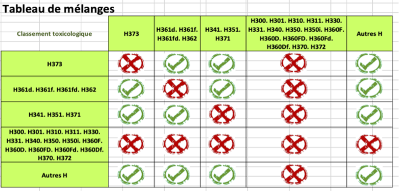 Le tableau ci-dessous indique les autorisations ou interdictions réglementaires de mélanges de produits phytosanitaires :