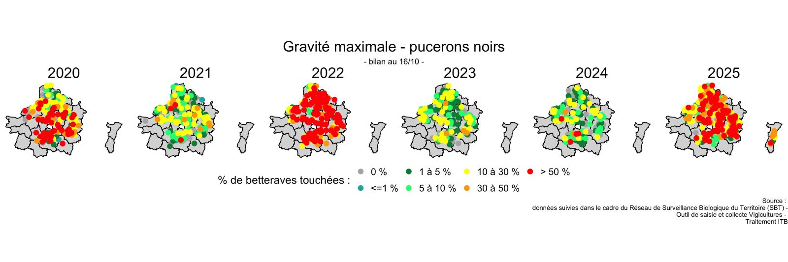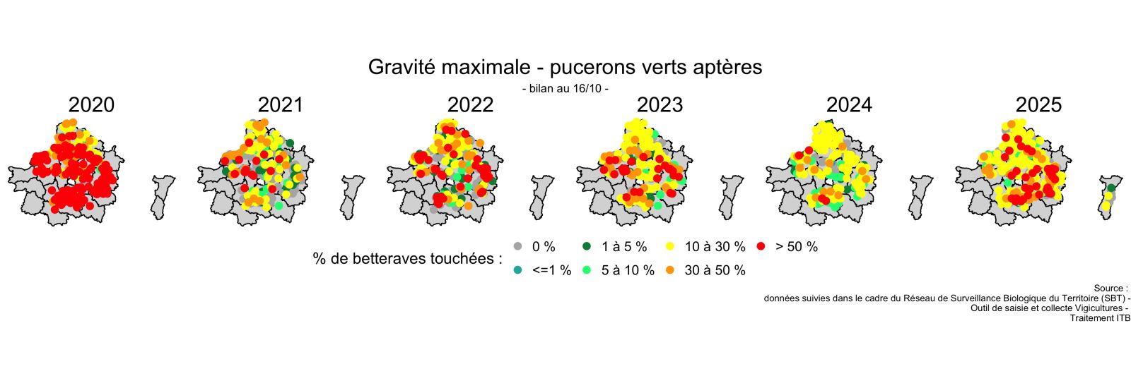 Le réseau d'épidémiosurveillance permet de suivre les bioagresseurs grâce à l'observation de 200 à 300 parcelles betteravières. Grâce à la mobilisation d'une centaine d'observateurs, les animateurs régionaux publient chaque semaine l'état de santé des betteraves dans les Bulletins de Santé du Végétal (BSV). De plus, ces données alimentent en temps réel les outils Alerte de l'ITB.