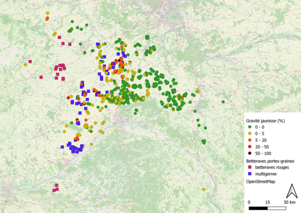 L’ouest de la région, zone la plus touchée en jaunisse, correspond aux zones couvertes par les portes-graines qui sont sûrement des réservoirs viraux de la jaunisse.