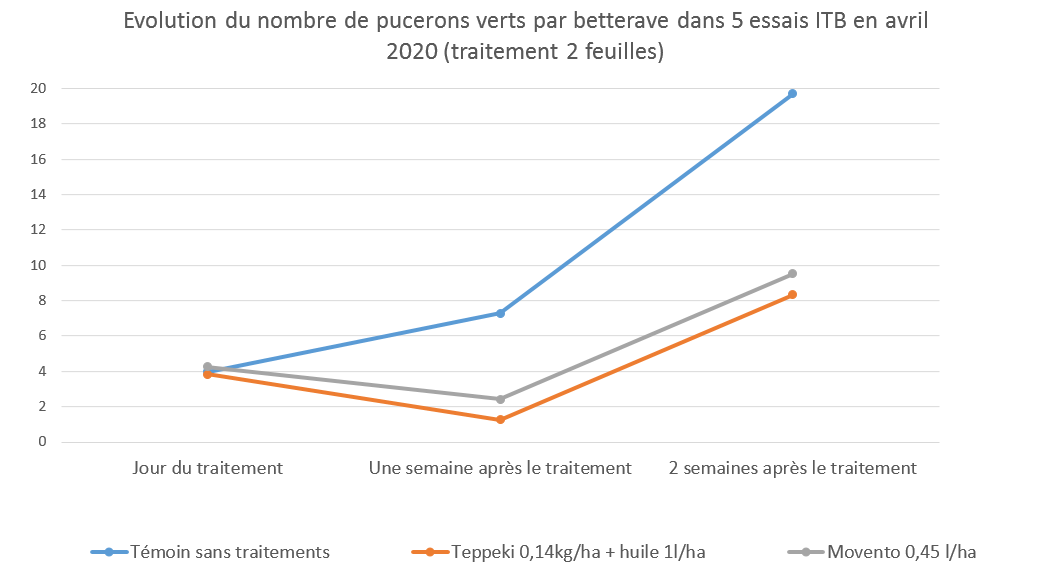 Dans l'essai ci-dessous situé dans le département du Loiret, la pression de pucerons a été extrêmement forte au printemps 2020. Les résultats sont exprimés en nombre de pucerons par plante, car la fréquence de plantes touchées est restée proche de 100 % quel-que-soient les traitements. Le jour du traitement, le 27 avril, le nombre de pucerons est très élevé (supérieur à 10 par plante). Il diminue significativement après les traitements à base de Teppeki ou Movento. Néanmoins, il y a toujours en moyenne un puceron par betterave, soit un niveau largement au-dessus du seuil de traitement.